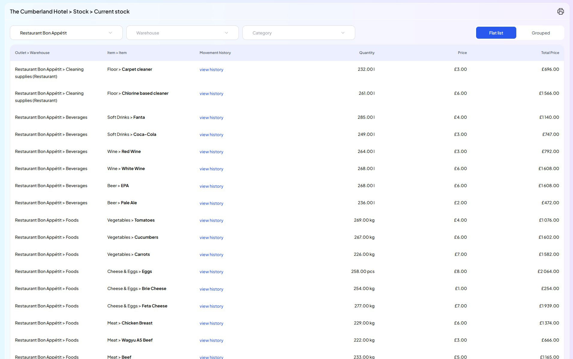 Real-time stock by outlet/category/item
