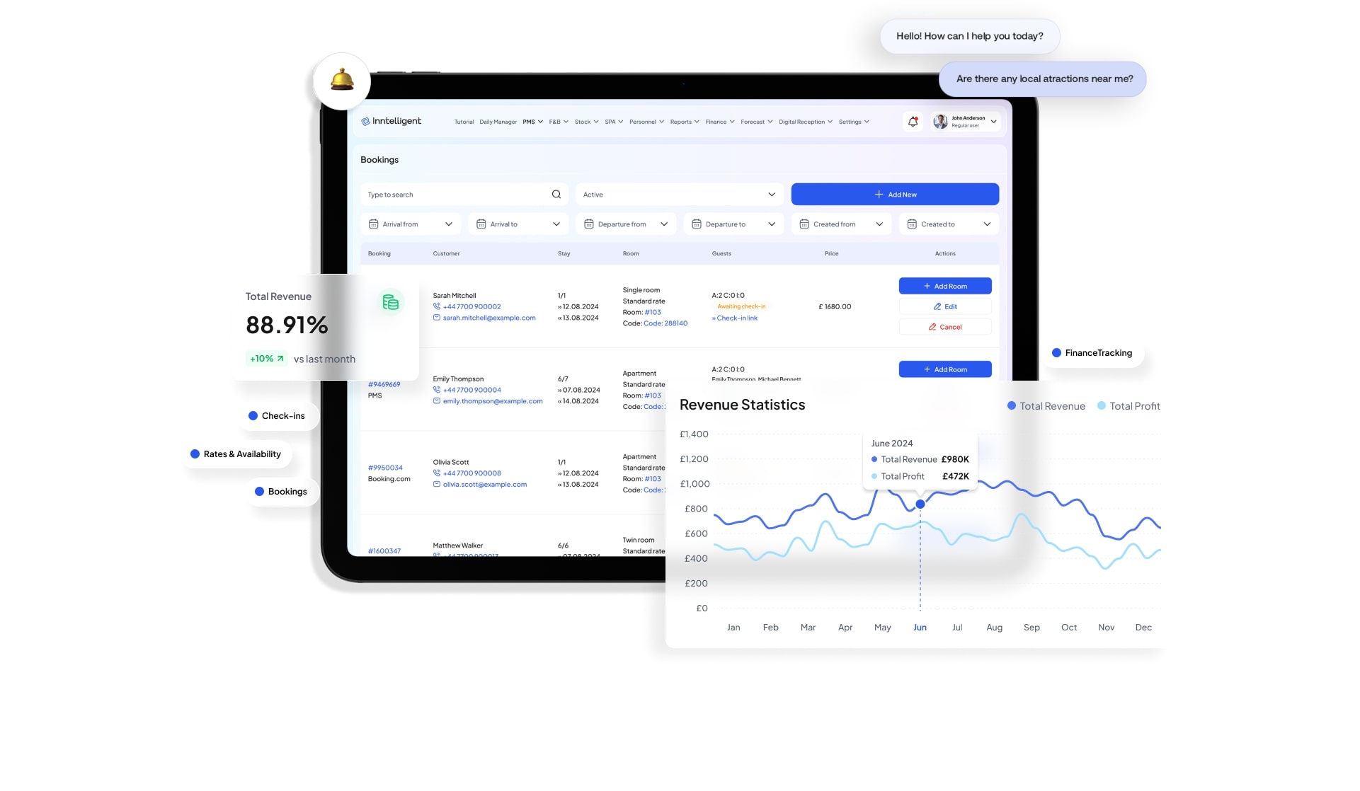 Elevate your guests' stay with our advanced Inntelligent chatbot helping them in every step of their experience, from making a booking till check-out. It also simplifies guest communication and offers multilingual support, providing accurate information about the hotel, local attractions and amenities.